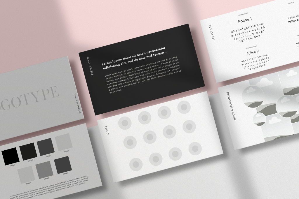 Je mènerai pour vous une réflexion sur l’identité visuelle de votre marque. Je penserai tous les éléments : variation de logotype et variations, code couleurs, typographie, polices signatures, motifs, fonds, mood board…Votre univers de marque sera unique et authentique.